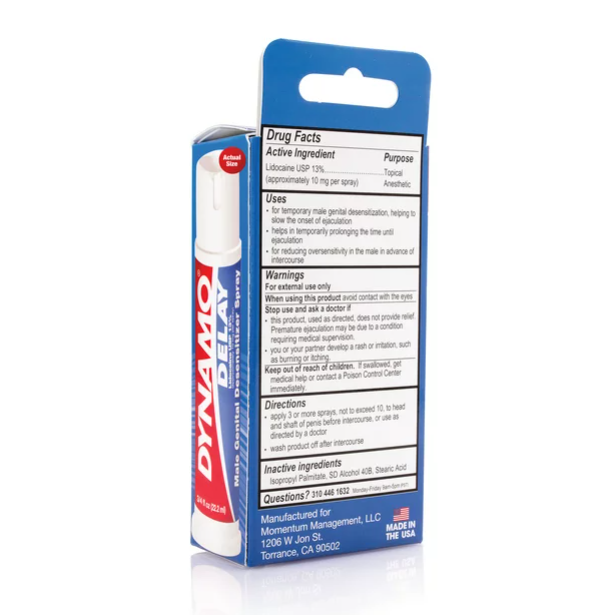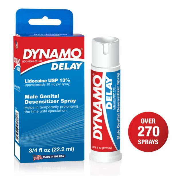 Dynamo 延迟男性脱敏喷雾剂,每瓶 270 多次喷雾剂是一种用于早泄 (PE) 的非处方喷雾剂,但任何人都可以使用它来减缓性高潮的发生。 DYNAMO DELAY 采用经过临床测试的速效配方,可提供安全有效的结果,帮助夫妻享受更持久的爱情。这种无刺激性的喷雾使用浓缩的 13% 利多卡因配方可暂时延长射精时间,可在几分钟内产生局部麻木感,并持续数小时!提高耐力,增加耐力,延长快乐。 Dynamo Delay 的浓度比领先品牌高 35%,产品含量高 50%。